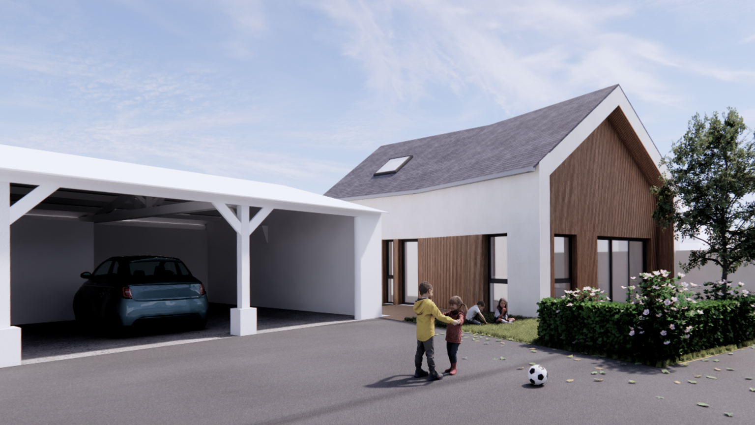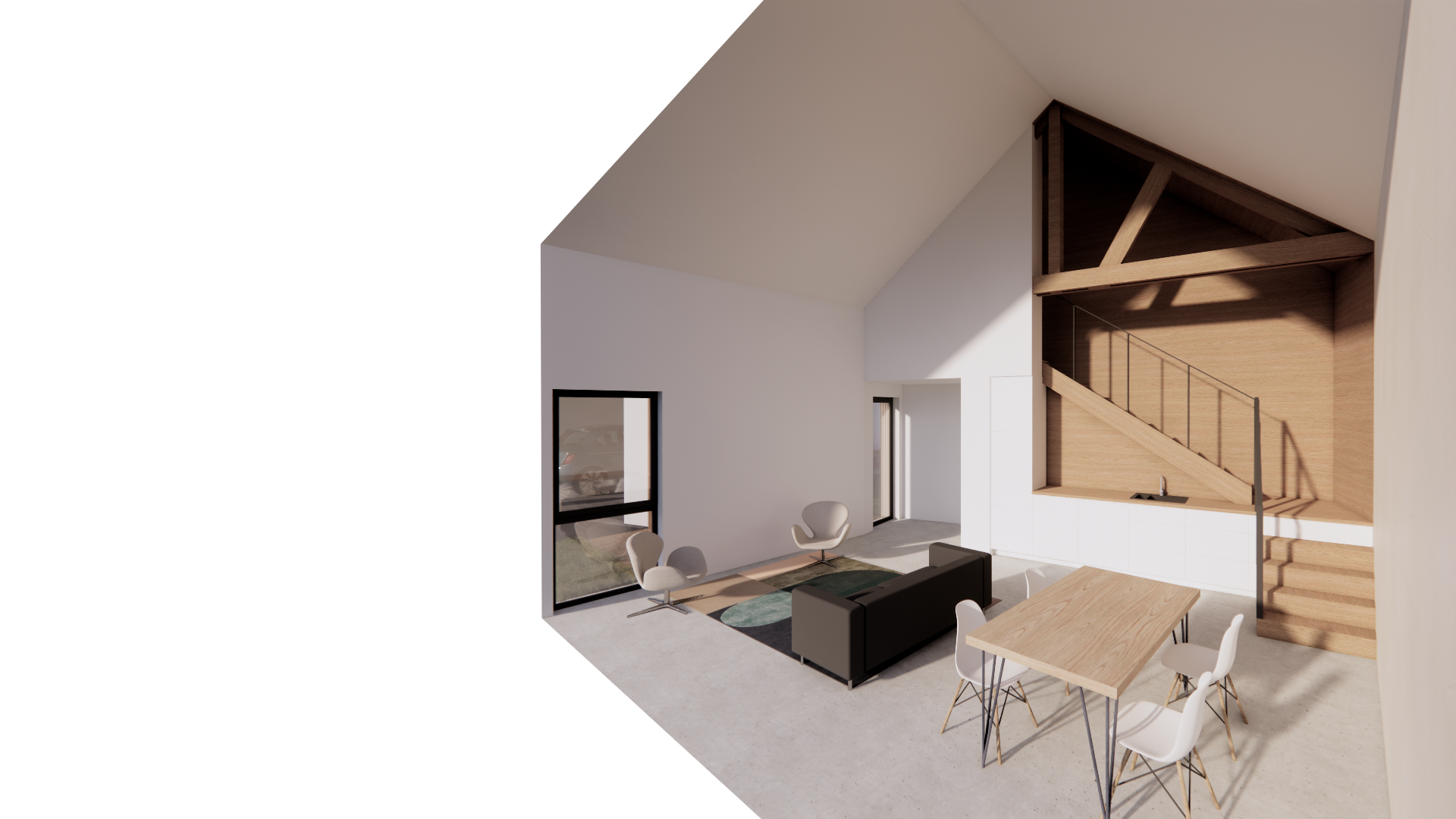 La maison, pensée pour une vie familiale, accueille deux chambres dont une à l’étage, ainsi qu’une cuisine ouverte sur un espace de vie lumineux et fluide. Fonctionnalité, générosité spatiale et identité affirmée définissent ce projet à la fois simple et singulier.